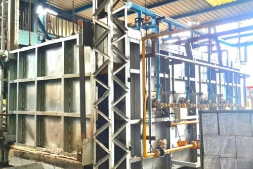 Various grades of steel in the form of forgings, castings, fabricated components, etc., can be annealed, normalized, hardened, stressed, solution-annealed, tempered, etc. using a Bogie Hearth Furnace, also called a car bottom furnace. The image displays a double-ended bogie hearth furnace with a 15-ton capacity. Two bogies are provided to save time and energy; one is kept within the furnace while the other is unloaded and reloaded for the subsequent cycle. This is a dual fuel system, meaning it uses both LPG and HSD and is controlled by a PLC and SCADA. The door and bogie are moved by electro-mechanical means.